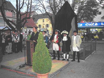 Fertigstellung und bergabe am 12.10.2006 B rgermeister Stefan Martus bei der Ansprache. Im Hintergrund eine historische Gruppe aus dem Theaterst ck Der letzte Kommandant , aufgef hrt 1999, von Uli Pfitzenmeier, Theatergruppe Alt-Udenheim