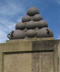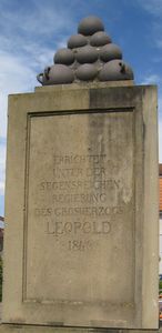 Die aufgesetzte Pyramide mit den Kugeln sollte unmissverst ndlich daran erinnern, dass die Zerst rung der Stadt durch die Kanonen, M rser und Haubitzen der franz sischen Revolutionsarmee erfolgte. Die einzelnen Geschosse hatten damals schon ein Gewicht bis zu 130 Pfund und konnten als Vollkugeln, Brandbomben oder auch Explosivgeschosse verschossen werden. Die glatte Kanonen schossen nur mit Vollkugeln und Kart tschen. Die Haubitzen und M rser verschossen Hohlgeschosse mit Sprengladungen oder Brandf llungen.